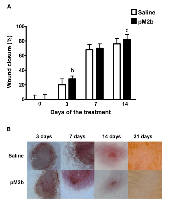| Figure 1: Wound closure of pM2b-treated lesions in the rat skin. Six round full-thickness wounds (6 mm diameter were made on each animal (n=8) and evaluated at different times after wounding. Three lesions at the right side were topically treated with pM2b (50 μl, 230 nM) and the other three lesions at the left side were treated with the vehicle saline. (A) Wound measurements as percentage of the initial wound area (0% closure). (B) Representative images of treated wounds. Mean ± SEM, n=24, bp<0.01, cp<0.05 vs control. |