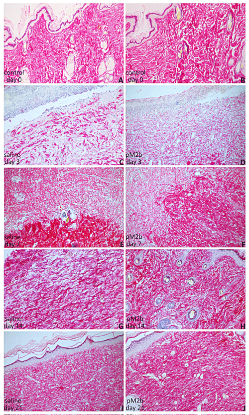 | Figure 3: Picrosirius stained sections of post-wounding recovering tissue. Full-thickness excisions from the wounding site topically treated with pM2b (50 μl, 230 nM) or saline were subjected to histological analysis.Slides containing mice skin were stained with picrosirius red, and examined by bright field. The samples dermis group controls showing thick bundles of collagen, stained in red. |