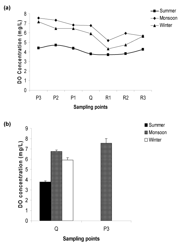 | Figure 1: a) The level of DO (mg/L) for water samples at different points of river Ganga with seasonal variation, b) The high level of DO (mg/L) confluence point Q, during monsoon season as compared to upstream point P3. Statistical significance is given in comparison to control *P<0.05. |