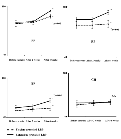 | Figure 2: SF-36 before and after exercise (n=57). Significant improvement was found at 4 weeks in the extension-provoked LBP in PF (p=0.003), RP (p<0.0001), BP (p=0.0017) compared with the flexion-provoked LBP. Physical Functioning (PF), Role Physical (RP), Bodily Pain (BP), General Health (GH) |