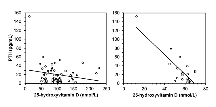 | Figure 3: Correlation between PTH and 25-hydroxyvitamin D.Circles show the individual data points and the line shows the least-squares line. Left panel, in all subjects. There is no correlation betweenUca/Ucrand 25-hydroxyvitamin D (n=58, r2=0.078, p is ns). Right panel, subjects with 25-hydroxyvitamin D <80 nmol/L. Here, there is significant correlation (n=17, r2=0.469, p< 0.005). The outlier in both panels was the subject found to have biochemical rickets. |