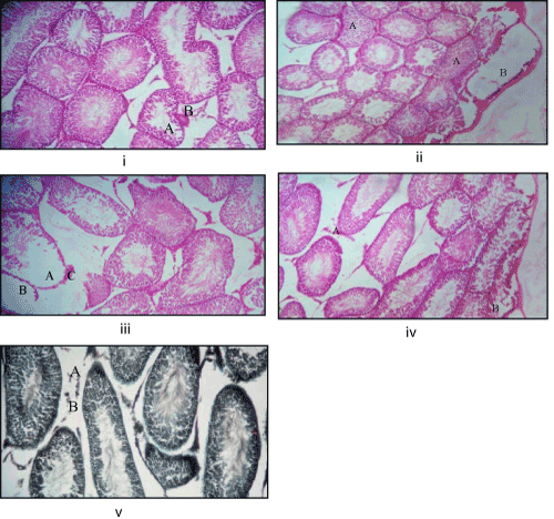 | Figure 3: (i) Ts of testis of group III albino rat after giving carbaryl 100 mg/kg body wt orally showing marked variation in shape of seminiferous tubules of testis (A) Dilated blood capillaries in the interstitiun of testis (B) (h & e stain x 100), (ii) Ts of testis of group III albino rat after giving carbaryl 100 mg/kg body wt orally showing collection of cellular masses in lumen of several sections of seminiferous tubules (A) Loss of germinal layers of cells of seminifous tubule more marked towards periphery (B) (h & e stain x 100), (iii) Testis of group III albino rat showing severe degenerative changes in spernatogenic cells (A) Loss of spermatids and spermatozoa (B) Interstitial oedema (C) (h & e stain x 100), (iv) Testis of group III albino rat after giving carbaryl 100 mg/kg body wt orally showing marked interstitial oedema (A) Cell necrosis (B) (h & e stain x 100), (v) Testis of group III A rat after giving carbaryl 100 mg/kg body wt orally showing interstitial oedema (A) Interstitial cells degeneration (B) (masson’s trichome x 100). |