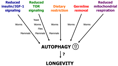 | Figure 1: Conserved longevity pathways and processes, which modulate aging via autophagy. Additional interventions not listed here, e.g., the polyamine spermidine may also engage autophagy as a possible effector mechanism to extend lifespan. For simplicity, the interactions between the pathways are not shown, whereas the degree of conservation is indicated. Whereas the mechanisms by which autophagy affects aging through these longevity paradigms are not yet fully elucidated, several positive regulators of autophagy have been identified, including the forkhead transcription factor FOXO (nsulin/IGF-1 pathway, mammals), the histone deacetylase SIRT1 (dietary restriction, mammals), the energy sensor AMPK (insulin/IGF-1 signaling and dietary restriction, mammals and worms), and the forkhead transcription factor PHA-4/FOXA (dietary restriction and germline removal, worms). |