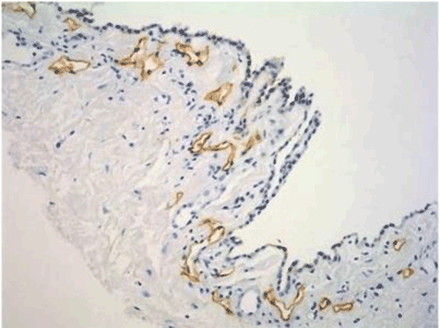 | Figure 4: Lymphatic vessels of subperitoneal tissue stained with D2-40 monoclonal antibody. Lymphatic vessels are distributing in the subperitoneal tissue between 1 to 80 micrometer from the peritoneal surface. Ly: lymphatic vessel, PM: peritoneal mesothelial layer (Figure 1, region 1) (from a 53 years-old patient of gastric cancer, of stage IV with ascites). |