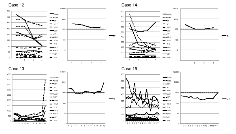 | Figure 4: A diachronic change of coma grade, clinical data level and MD of four fulminant hepatitis subacute type death cases. A coma grade and a clinical data level are shown in the left side of each case, and MD is shown in the right side. A broken line means the level of 1,000 of MD. |