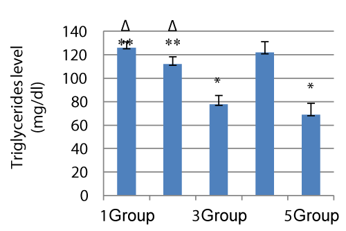 Group1: received 1% cholesterol and 1% walnut leaf powder in daily diets. Group2: received 1% cholesterol and 2% walnut leaf powder in daily diets. Group3: received 1% cholesterol and 5% walnut leaf powder in daily diets. Group4: received 1% cholesterol in daily diet (Hypercholesterolemic control). Group5: received normal daily diet (normal control). * Significant differences with group 4. ** Significant differences with group 5. Δ Significant differences with group 3. |