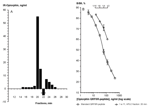 | Figure 1: Analyses of human plasma by RP-HPLC and ELISA-Opiorphin. A. HPLC chromatography in tandem with ELISA-opiorphin detection of individual plasma extract. The plasma sample was extracted using a C18 solid-phase extraction procedure before loading onto a C18-ACE-HPLC column. After lyophilization each 1 min fraction was analyzed by ELISA-Opiorphin and the results expressed as concentration of immunoreactive (IR) opiorphin in ng/ml (Y axis) by HPLCfraction in min (X axis). B. Analysis of individual purified plasma sample using ELISA-Opiorphin method. Standard curve (open squares) relating QRFSR-peptide concentration in ng/ml (log scale, X axis) to the percentage of binding in the presence (B) of standard peptide / binding in the absence (B0) of the standard peptide (linear scale, Y axis). Sample curve (open circles) relating serially diluted (2-fold) individual purified plasma sample to B/B0, % response. Note that there is a parallel between the dose-response standard curve and the serial dilutions of the sample. Each point represents the mean ± SD of duplicates. |