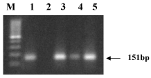 | Figure 1: PCR based analysis of amplified product of Nanog3 gene (151bp) showing complete disappearance of band in lane-2, while lane- 3 & 5 showing up-regulation (over expression) and lane - 4 showing down –regulation (regression) of amplified product and Lane -1 act as a positive controls. |