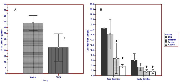 | Figure 1: Total, free and acetyl carnitine in COPD patients and healthy controls. Bars represent the mean values of different analytes in the studied groups. |