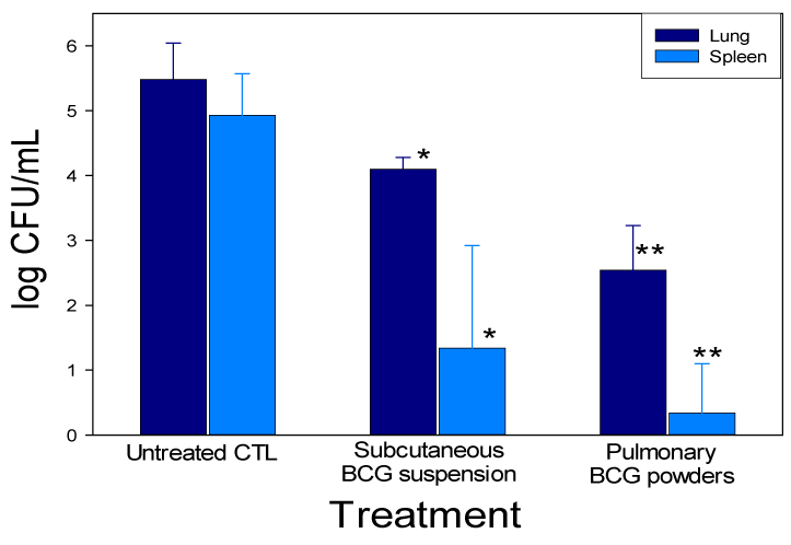![]() * Significantly smaller than untreated controls, ** significantly smaller than BCG SQ and untreated control |