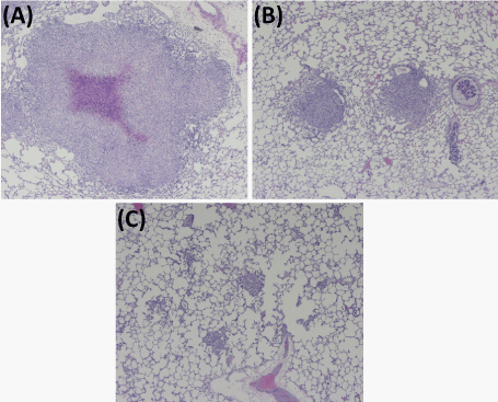 | Figure 4: Lung histopathology after bacterial challenge of guinea pigs immunized with different BCG formulations by different routes: (A) Untreated controls; (B) animals immunized with BCG powder suspension by the subcutaneous route; and (C) animals immunized with BCG dry powders by the pulmonary route. |
