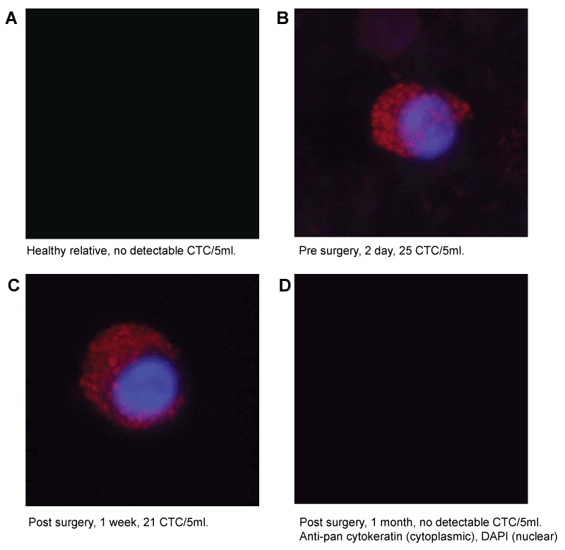 A. No CTCs are detected in healthy relative control. B. 25 CTCs detected two days preoperatively by anti-keratin, anti-CD45 and DAPI staining. C. 21 CTCs detected seven days postoperatively with the same staining as B. D. No CTCs detected 30 days postoperatively |