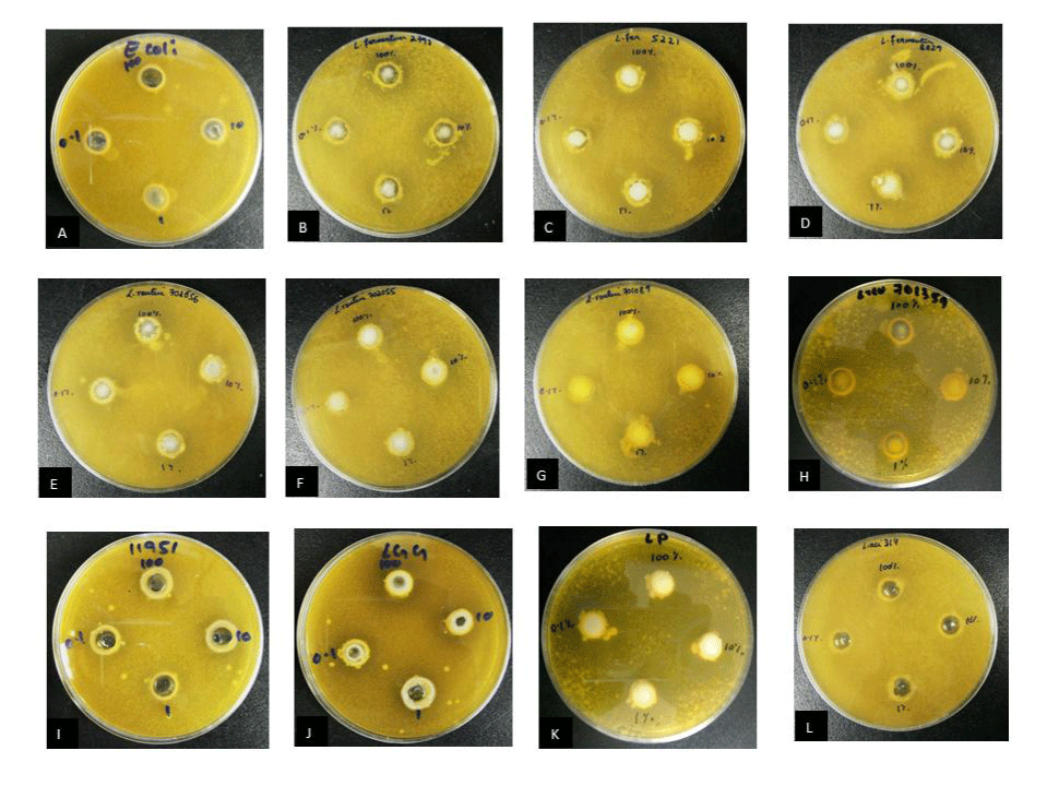 | Figure 2: Inhibition assay for C. albicans ATCC 11006 demonstrating the zone of inhibition around the wells containing: (A) Negative Control –E. coli ATCC 8739; (B) Test strain L. fermentum NCIMB 8829; (C) Test strain L. fermentum NCIMB 2797; (D) Test strain L. fermentum NCIMB 5221; (E) Test strain L. reuteri NCIMB 701089; (F) Test strain L. reuteri NCIMB 701359; (G) Test strain L. reuteri NCIMB 702655; (H) Test strain L. reuteri NCIMB 702656; (I) Test strain L. reuteri NCIMB 11951; (J) Positive control- L. rhamnosus ATCC 53103; (K) Test strain L. acidophilus ATCC 314; (L) Test strain L. plantarum ATCC 14917 and *shows the clearance zone. The four wells contained the probiotic overnight culture of desired concentration diluted using sterile MRS: 100% (v/v), 10% (v/v), 1% (v/v) and 0.1% (v/v). The agar plates were incubated for 48 hours at 37°C and 5% CO2. |