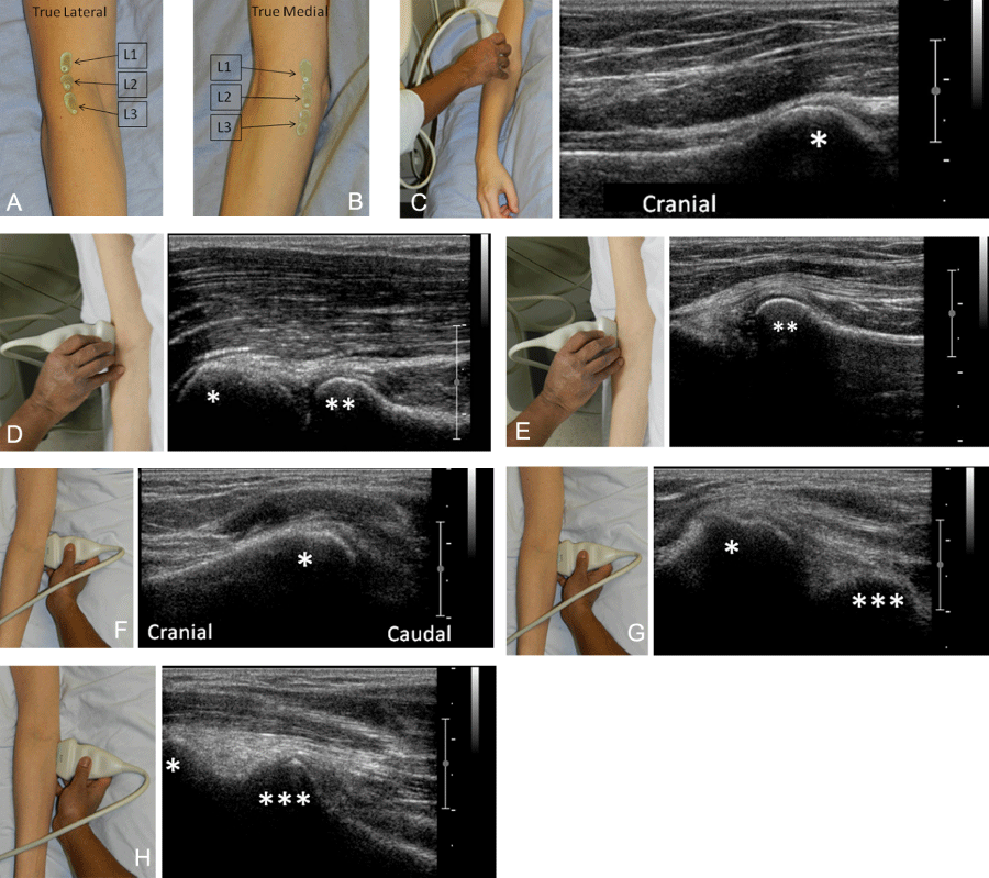 ![]() Abbreviations: COR: Coronal; MED: Medial; LAT: Lateral The transducer positions used for true lateral imaging acquisition of the elbow joint at the levels L1, L2 and L3 are shown. The positions of the transducer placed laterally at the level L1 (C), L2 (D) and L3 (E) in relation to the central position of the joint are illustrated with accompanying sonographic images in a healthy volunteer. The distal humeral epiphysis (*) and proximal epiphysis of the radius (**) have been marked. The transducer positions used for true medial imaging acquisition of the elbow joint at the levels L1, L2 and L3 are shown. The positions of the transducer placed medially at the level L1 (F), L2 (G) and L3 (H) in relation to the central position of the joint are illustrated with accompanying sonographic images in a healthy volunteer. The distal humeral epiphysis (*) and coronoid process of the ulna (***) have been marked. |