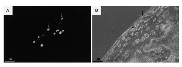 | Figure 1: Bromodeoxyuridine (BrdU) incorporation into developing articular cartilage. Mid-sagittal paraffin wax sections through the proximo-distal axis of the knee joint of M. domestica showing the effect of BrdU incorporation on articular cartilage growth 1 month post-injection. [A, B] Comparative fluorescence and phase contrast images [A, B, respectively] showing the distribution of BrdU in the distal femoral condylar cartilage. BrdU is incorporated into a small number of surface zone cells (arrows) and into a relatively greater proportion of underlying transitional zone cells. |