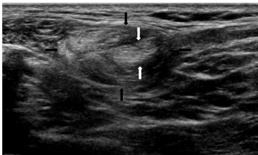 | Figure 1: Oblique US image of the left posterior cervical triangle showing a mass comprising a superficial, oval hyper-echogenic structure (black arrows) that contains multiple linear striations similar to the subcutaneous fat. This is suggestive of a lipomatous lesion. The deeper margin of the mass is inseparable from a hypo-echogenic linear structure (white arrows) containing linear striations, which is suggestive of muscle. The precise nature of the muscular component was unclear. A similar muscle was not present in the right side of neck. |
