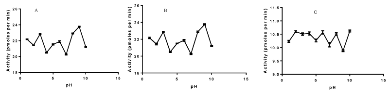 | Figure 2: Effect of pH on protease activity of ammonium sulfate extract. (A): leaf, (B): bark and (C): root extract. Reaction mixture contained 25 μg BSA (1 mg/ml), 12 μl enzyme (28.56 μg) for leaf, 19 μl enzyme (11.78 μg) for bark and 22 μl enzyme (13.42 μg) for root were taken and volume was maintained to 200 μl buffers of different pH. After 30 min incubation at room temperature direct method was performed. |