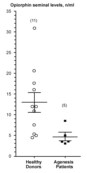 | Figure 4: Dot plot representations of semen opiorphin levels in healthy donors and CBAVD patients. Each individual opiorphin value is represented by an open circle for healthy donors (n=11) and by a black square for CBAVD patients (n=7). The mean ± SEM for both groups are represented. |