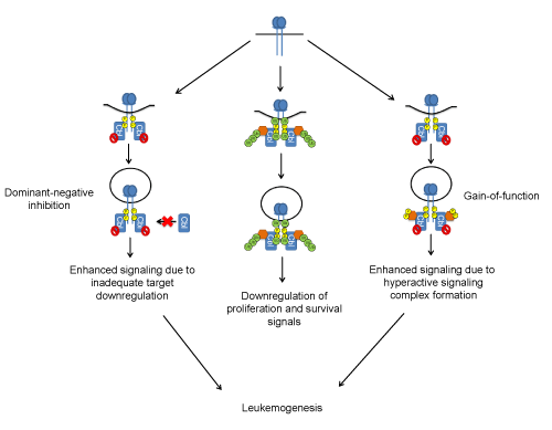 | Figure 3: Potential mechanisms of mutant Cbl-induced leukemogenesis. (left) Mutant Cbl proteins retain the ability to bind to activated protein tyrosine kinases (shown is a generic receptor tyrosine kinase), but cannot promote their ubiquitination. Mutant Cbl (indicated by the red “no” symbol; typically expressed in cancers from duplicated mutant alleles) interacts with activated target tyrosine kinases in competition with remaining wild-type Cbl and/or Cbl-b (dominant-negative inhibition); the ineffective degradation and downregulation of activated protein tyrosine kinases results in enhanced signaling to promote leukemogenesis. (right) Mutant Cbl proteins bound to activated protein tyrosine kinases juxtapose downstream signaling effectors (that interact with Cbl mutants via intact C-terminal regions) to activated tyrosine kinases. These stabilized and hyperactive macromolecular signaling complexes enhance signaling (gain of function) through the downstream signaling pathways that are negatively regulated by WT Cbl under physiological conditions and possibly by novel pathways. (middle) These mechanisms contrast with the normal case, whereby Cbl binds to activated protein tyrosine kinases and also downstream signaling effectors, ubiquitinating both and resulting in downregulation of signaling. |