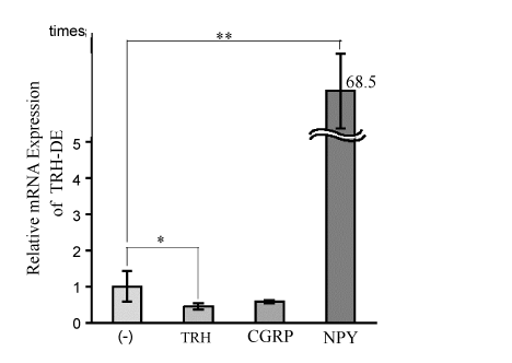 | Figure 3: Regulation of TRH-DE mRNA in human pulp cells. Enhanced expression of TRH-DE mRNA 24 hours after treatment with 3×10-6 M neuropeptide Y (NPY), and significantly lower expression with 10-7 M thyrotropin-releasing hormone (TRH) in canine unfractionated total pulp cells.Little effect by 10-7 M α Calcitonin Gene Related Peptide (CGRP). Data are expressed as means ± SD derived from three independent experiments (*P<0.05, **P<0.001). The experiment was repeated three times, and one representative experiment is presented. |