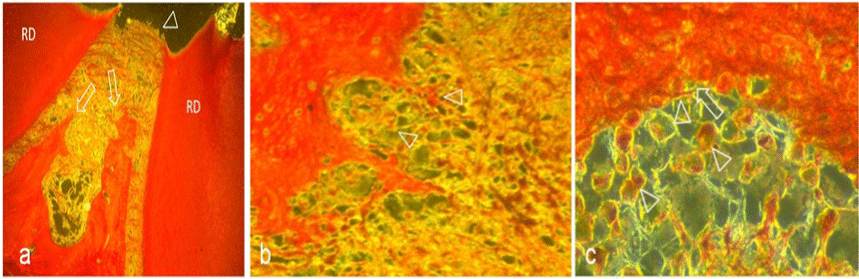 | Figure 1: Representative sections obtained from furcal perforation sites repaired with Geristore (a-c). a. Masson trichrom-stained section showing no reparative hard tissue apposition (open arrowhead) over the furcation site and severe interradicular bone resorption (open arrow). RD: radicular dentin. (Original magnifications 30X). b. Section from another specimen showing multinucleated osteoclast cells (open arrowhead) and inflammatory cells infiltrate separated by a tunnel defect (open arrowhead). (Original magnification 40X). c. Modified trichrome-stained section showing multinucleated osteoclast cells (open arrowhead) and resorptive lacunae (open arrow). |