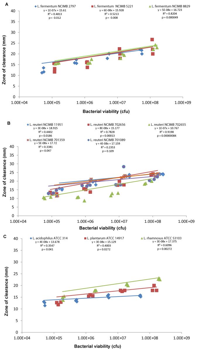 | Figure 3: Inhibition of S. mutans ATCC 702062 by probiotic strains : A) L. fermentum NCIMB 2797, L. fermentum NCIMB 5221 and L. fermentum NCIMB 8829; B) L. reuteri NCIMB 11951, L. reuteri NCIMB 702655, L. reuteri NCIMB 702656, L. reuteri NCIMB 701359 and L. reuteri NCIMB 701089 C) L. acidophilus ATCC 314, L. plantarum ATCC 14917, L. rhamnosus ATCC 53103. Data reflects individual triplicate points and non-linear regression was performed to correlate bacterial viability with zone of clearance, generating the R2 values. |