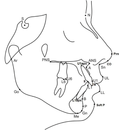 | Figure 1: Cephalometric points used in the analysis. sella (S), nasion (N), pronasale (Prn), nasal columella (Co), subnasale (Sn), upper lip (UL), lower lip (LL), soft tissue pogonion (Soft P), A point, B point, anterior nasal spine (ANS), posterior nasal spine (PNS), upper incisor apex (U1apx), lower incisor apex (L1apx), incision superius (Is), incision inferius (Ii), pogonion (P), gnathion (Gn), menton (Me), gonion (Go), articulare (Ar), the most labial point on the crown of the mandibular central incisor (L1), the most labial point on the crown of the maxillary central incisor (U1), the point located on the tip of the mesiobuccal cusp of the maxillary first molar (U6) and the point located on the tip of the mesiobuccal cusp of the mandibular first molar (L6). |