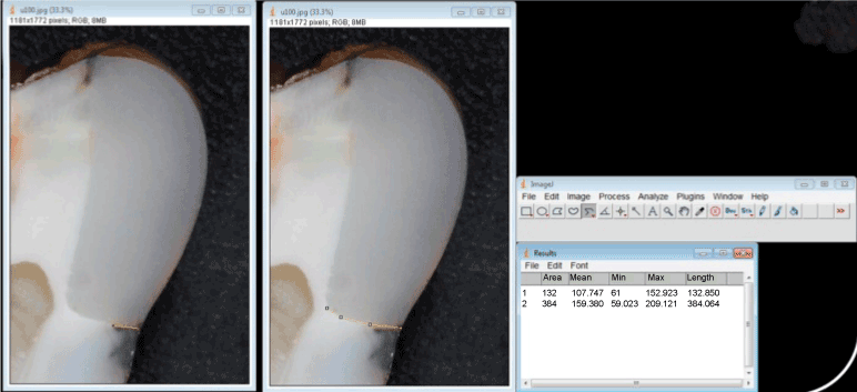 | Figure 5: Microleakage measurement using computer software Image J. The yellow line in the left picture represents the maximum penetration of the tracer. The central image exhibits the measurement of the entire cervical wall. On the right image the two length measurements are used to calculate the percentage of microleakage on dentin margin. The same procedure is realized for the enamel margins. |