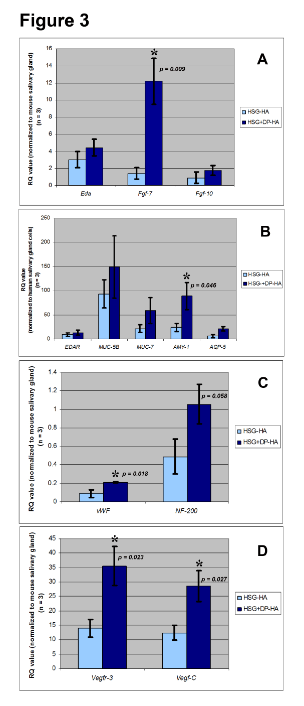 | Figure 3: Co-transplantation of HSG and DPSC demonstrated high expression of murine neural crest-derived mesenchymal and human salivary gland genes. (A-D) Q-RT-PCR showed RQ (Relative Quantification) values demonstrating differential gene expression in HSG alone and HSG cotransplanted with DPSC. The transplanted HSG and DPSC in HA hydrogel scaffolds expressed higher levels of murine Eda, Fgf-7, and Fgf-10, human EDAR, MUC-5B, MUC-7, AMY-1, and AQP-5, as well as murine vWF, NF- 200, Vegfr-3, and Vegf-C. (A) HSG+DPSC particularly expressed significantly higher Fgf-7 expression (> 10 folds compared to HSG transplants alone). (B) The HSG alone and HSG co-transplanted with DPSC expressed higher level of EDAR, MUC-5B, MUC-7, AMY-1, AQP-5 (approximately >10-150 folds compared to undifferentiated human submandibular salivary gland cells). AMY- 1 was expressed significantly higher in the co-transplanted tissues. (C and D) HSG+DPSC expressed higher level of mouse vWF, NF-200, Vegfr-3 and Vegf-C compared to HSG transplants alone. RQ values (n= 3) were normalized by the expression of mouse salivary gland or human salivary gland cells. Mouse Gapdh or human GAPDH was used for the internal control. Student’s t-test calculated * p ≤ 0.05. Error bars represent ± SEM. |