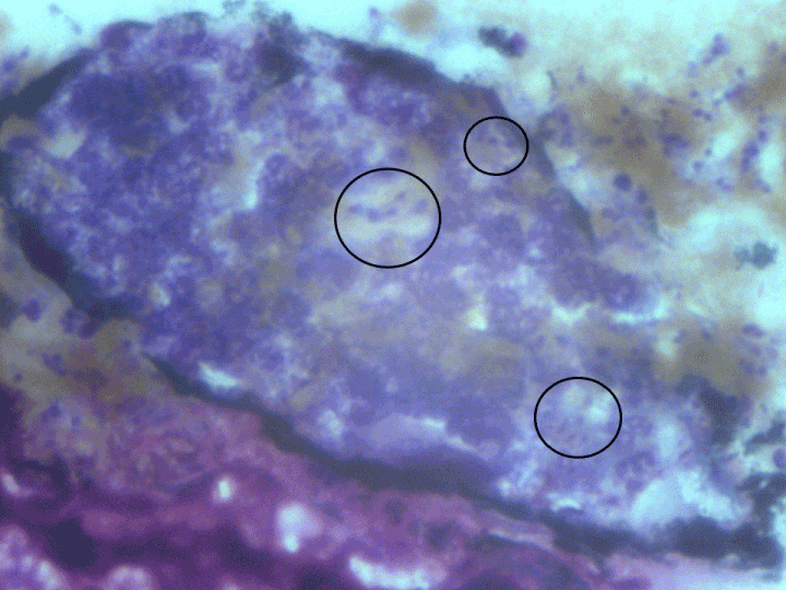 | Figure 7: Freeze dry section of a leech, twenty-four hours after infective blood feeding with Trypanosoma evansi. Several trypanosomes in the salivary glands are observed with extracellular location in both the central and peripheral regions (circles) (1.500 X). |