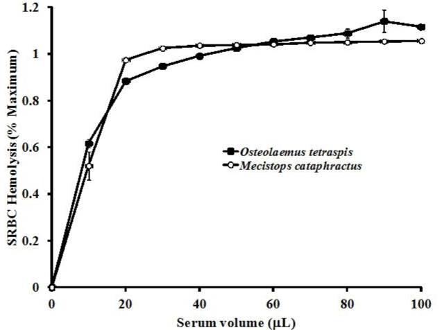 | Figure 1: Serum volume-dependent hemolysis of SRBCs. Incubation of 1% (v/v) SRBCs with different volumes of serum from Osteolaemus tetraspis Or Mecistops cataphractus for 30 min resulted in a volume-dependent hemolysis, as measured spectrophotometrically at 450 nm. The results are expressed as % of maximum hemolysis, relative to a positive control, and represent the means ± standard deviations, and represent the results of four independent determinations. |