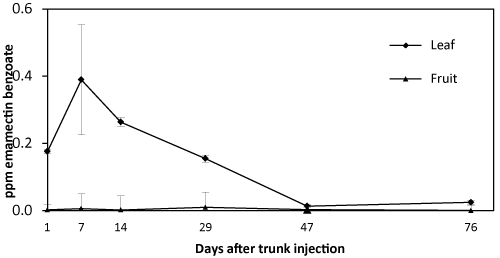 | Figure 3: Temporal distribution profile of trunk-injected emamectin benzoate in apple canopy during 2009 based on residue concentration in leaves and fruits. *MRL: maximum residue limit for imidacloprid in apple fruits is 0.02 ppm, set by the US Environmental Protection Agency (EPA). |