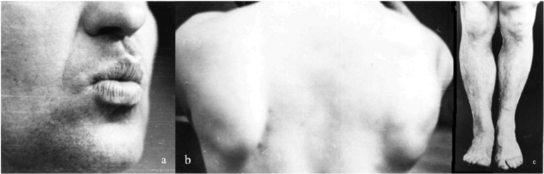 | Figures 4a-4c: Observation 8, family 2, proband’s brother, aged 36. Minimal atrophy of the upper lip on the right side (a), the scapulae sharply displacement outwards and forwards (b), inability to stand up on the heels is seen more clearly the left side (c). |