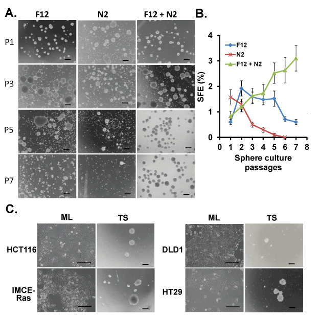 | Figure 1: Tumorsphere culture of colon cancer cell lines in the suspension medium. (A) Morphological examination of colon cancer cells cultured at different conditions. Morphological differences were visualized between tumorspheres maintained in the suspension medium (DMEM/F12 medium containing10 ng/ml bFGF, 20 ng/ml EGF, 0.4% BSA and 5 μg/m Insulin) supplemented with F12, N2 or both. The morphological changes were traced microscopically over serial passages. Original magnification: ×40; Scale bar = 200μM. (B) Tumorsphere-forming efficiency assay. One hundred cells per well were seeded into ultra-low attachment 96-well plates. The Y axis shows the sphere-forming efficiency, which is calculated by the average number of tumorspheres per one hundred seeded cells. (C) Monolayer and spheroid culture of colon cancer cell lines (HCT116, HT29, DLD1 and IMCE-Ras). Tumor cells cultured in DMEM containing 10% FBS exhibiting an epitheliallike monolayer morphology. Tumorspheres were grown in non-adherent culture dishes in the suspension medium containing10 ng/ml bFGF, 20 ng/ml EGF, 0.4% BSA and 5 μg/m Insulin) supplemented with both F12 and N2 nutrition for six days. All of the tested cell lines form typical smooth-edged tumorspheres in the supplemented medium. ML, monolayer culture; TS, Tumosphere; Scale bar = 200μM. |