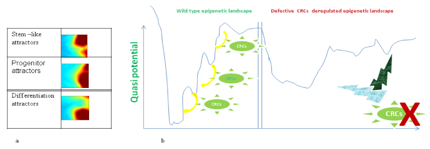 | Figure 1: The cancer “avalanche” model of CRCs regulated epigenetic land scape. a. Representative GEDI maps of stem-like attractos, progenitor/intermediate attractors and differentiation attractions. b. (Left panel) An illustration of hierarchy within an epigenetic landscape for a single transition pathway frow stem cell (top) to final cell type (bottom). (Right panel) Deregulation and modification of the epigenetic landscape as a consequence of defective CRCs regulated epigenetic landscape. |
