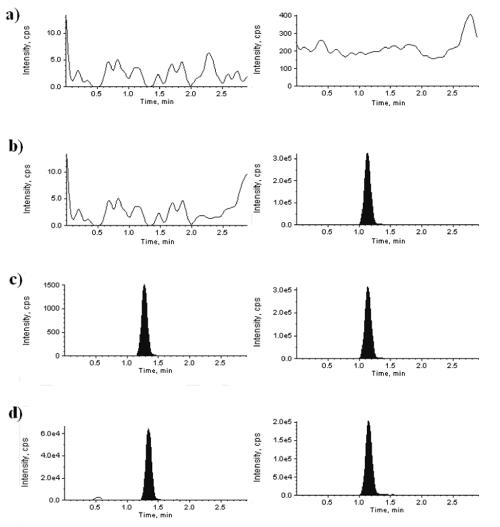 | Figure 2: Typical multiple reaction monitoring (MRM) chromatograms of desvenlafaxine (left panel) and internal standard (right panel). a) Blank plasma, b) Blank palsma spiked with internal standard, c) Blank palsma spiked with desvenlafaxine at LLOQ (0.5 ng/mL) and internal standard, d) Blank palsma spiked with desvenlafaxine at ULOQ (1500ng/mL) and internal standard. |