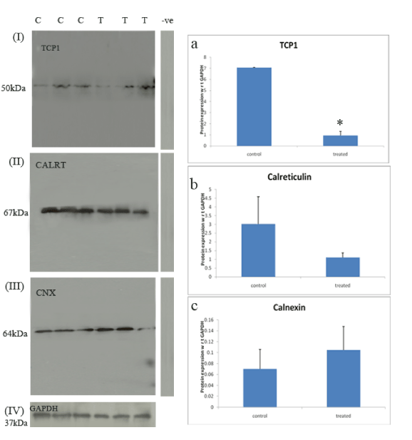 and failed spermiation condition. Panel I, II, III represents western blotting of the TCP-1, calnexin and calreticulin proteins respectively from tubules at stages VII-VIII in control group and treated group. –ve denotes negative control without primary antibody. Subpanel a,b,c denotes graphical representation of expression of TCP-1, calnexin and calreticulin proteins respectively in control (normal spermiation) and treated (failed spermiation) groups. Data n=3 animals, *=significant (p ≥ 0.02). |