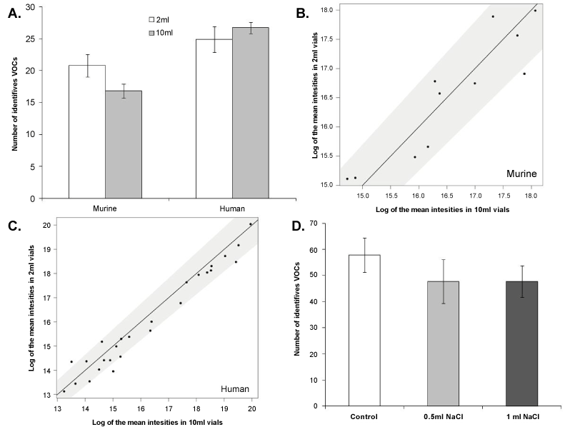 | Figure 3: Vial volume optimisation and salting-out. (A) Faecal samples collected from murine (n=4/volume, N=3) and human (n=4/volume; 10 ml=102.8 ± 1.7 mg, 2 ml=101.9 ± 1.2 mg, N=3) using two different vial volumes, 2 ml and 10 ml (mean ± SEM; t-test). (B-C) Comparison of the two vial volumes studied, showing the mean of the abundance for each identified compounds (murine=11, humans=26) per size of vial (n=4/time) for both murine (B) and human samples (C), plotted against the other. The grey area indicates the 5% tolerance around the optimal function x=y. (D) Faecal samples collected from an individual human treated with 0.5 ml NaCl and 1 ml NaCl and compared to a control sample (n=3/treatment; control=97.9 ± 2 mg, 0.5 ml NaCl=100.4 ± 3.6 mg, 1 ml NaCl=99.5 ± 3.2 mg) (mean ± SEM); ANOVA with Tukeys HSD followed by Bonferroni; *p<0.05, **p<0.01 and ***p<0.001. |
