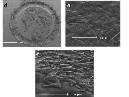 | Figures 1(d -f): Scanning electron micrographs of cells on a MALDI-TOF MS target plate (1d) cells after 150 sec exposure of matrix; shows clumping with areas devoid of cells (1e,1f) different magnification of cells after five minutes exposure to DHB. Although damage to the outer polymeric layers of cells is clearly evident, the cells remain intact and smooth. |
