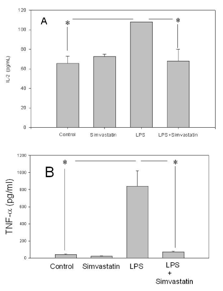 | Figure 1: Effect of Simvastatin on LPS-induced IL-2 and TNF-alpha levels. Mice were treated with Simvastatin and LPS as described in Materials and Methods. The inflammatory response was determined be measurement of the cytokines IL-2 and TNF-α. In A Levels of IL-2 were determined 3 hs after treatment with LPS. LPS–induced IL-2 levels were found to be higher in LPS groups than that of LPS+Simvastatin group. In B LPS-induced TNF-α concentration were determined after treatment of mice with simvastatin, LPS, or simvastatin and LPS as described in material and methods. The data is an average of 3 experiments with 8 mice in each group. The differences between control and LPS, and LPS X LPS+ simvastatin were statistically significant (*). |