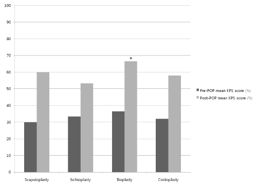 | Figure 2: The Karnofsky performance scale (KPS) score before and after percutaneous osteoplasty (POP). A significant postoperative increase in KPS scores was observed for the POP of the ilium (* P < 0.05). Other 3 kinds of POPs could not calculate for small candidates; however, they also showed significant postoperative increases in KPS. |