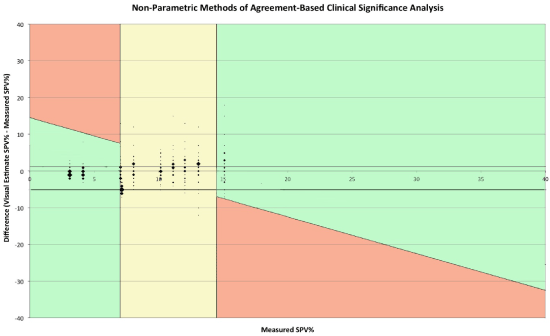 | Figure 3: The difference between estimated and actual Systolic Pressure Variation (SPV) is displayed against the actual SPV, using the non-parametric approach of agreement based on the clinical significance analysis [10]. The size of each data point represents the number of subjects who selected every single estimate. The color zones displayed in this figure are defined according to the definition from Thiele et al. in 2012 [2]. |