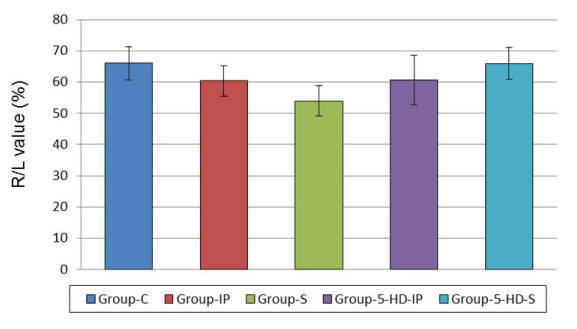 | Figure 2: The figure shows R/L value (%), which means the area at risk expressed as percentage of left ventricle. Data are expressed as mean ± SEM. Area at risk revealed no significant difference among all groups, suggesting that the changes in the infarct size observed among the groups did not depend on R/L. Group-C: a control group (n=9). Group-IP: a ischemia-preconditioned group (n=10). Group-S: a sevoflurane-preconditioned group (n=6). Group-5- HD-IP: a group which was given 5HD 10 min before ischemic preconditioning (n=6). Group-5-HD-S: a group which was given 5HD 10 min before sevoflurane exposure (n=6). |