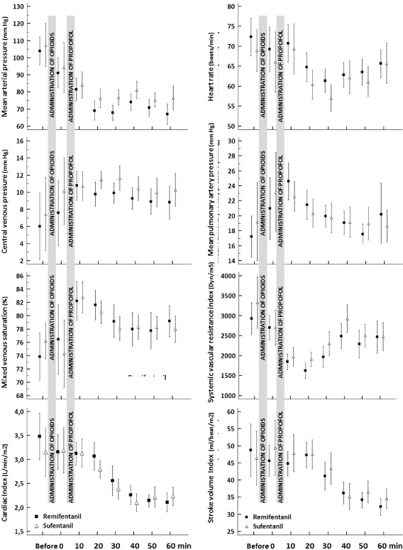 | Figure 2: Invasive haemodynamic baseline values the first 60 minutes after infusion of propofol divided into treatment groups. All parameters, except central venous pressure and mixed venous saturation declined statistically significant over time (P<0.001, 2-way ANOVA). Patients receiving remifentanil had lower mean arterial pressure, P<0.001, central venous pressure, P=0.003 and systemic vascular resistance index, P=0.005. Heart rate (HR) was higher than in sufentanil group, P=0.025. No statistically significant differences were seen for cardiac index (CI), stroke volume index (SVI), mean pulmonary artery pressure (mPAP) or mixed venous saturation (SvO2). |