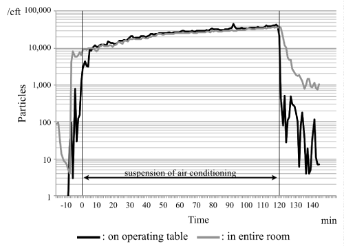 | Figure 7: Air cleanliness in LED room. Immediately after suspension of air conditioning, no difference was observed in air cleanliness on the operating table and in entire room. Air cleanliness surpassed the designated level 8 min after suspension and eventually reached approximately 45,000/ft3. |