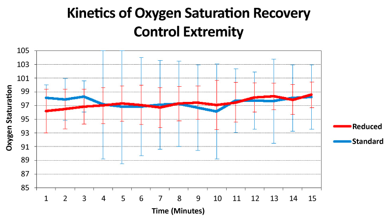 | Figure 2: The recovery of the oxygen saturation of the control extremity as a function of time.A small decrease in oxygen saturation similar to that seen in the operative extremity is demonstrated, but it is less pronounced and occurs slightly later at about 8 minutes and recovered at approximately 12 minutes.This decrease in oxygen saturation was dampened in the reduced pressure group (group II), as the saturation dropped an average of 2 minutes later and by only 1-2 mmHg.This difference did not reach statistical significance. |