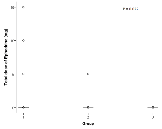| Figure 1: Total dose of ephedrine required during the study. Group 1=Sitting up for 5 minutes after spinal anaesthetic administration; Group 2=Sitting up for 7 minutes after spinal anaesthetic administration; Group 3=Sitting up for 9 minutes after spinal anaesthetic administration. The solid horizontal line (●)represents the median for all groups, and the circles (ο) represent the total dose administered to either one patient or several superimposed patients. |