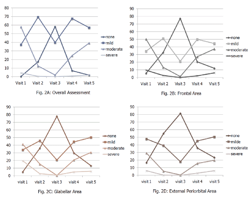 | Figure 2: Summary of wrinkles degree assessments in the upper third of the face as measured by three independent examiners at each visit. Data are reported overall (A) and divided by area (B, frontal area; C, glabellar area; D, external periorbital area). |