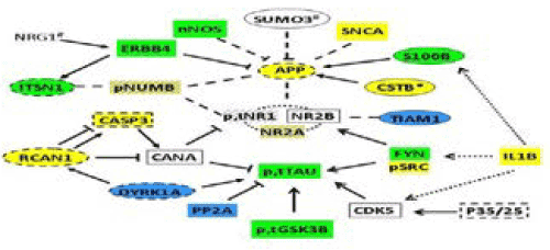 | Figure 4: Functional interactions of HSA21 and AD-relevant proteins. Interactions relevant toAPP processing, NMDAR activation and Tau phosphorylation are shown. Abnormal levels of proteins in different DS mouse models relative to corresponding littermate controls are indicated as: yellow, Dp10; blue, Tc1; green, Dp10 and Tc1; striped, Dp17; yellow striped, Dp10 and Dp17; dashed outline, Ts65Dn. No fill, no difference from controls in any model. See Figures 2 and 3 and Supplementary Table S3 for magnitude, direction and phosphorylation-specificity of changes.Ellipse, HSA21 encoded protein; rectangle, non-HSA21 protein. Solid arrow, activation; blunt line, inhibition; dashed line, protein-protein interaction; dashed arrow, indirect activation. *, measured in cortex only; #, not measured. See Table 1 and the text for references. |