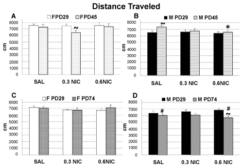 | Figure 2: Sex differences and effects of nicotine withdrawal on open field locomotor activity. After acquisition of their baseline open field activity (PD29), mice were injected with 0.3 or 0.6 mg/kg nicotine from PD 30 to PD 44, and re-tested in the open field A, B: Distance traveled in the open field, 1 day before (PD29) and 1 day after (PD45) nicotine treatment, in females (A) and males (B). C, D: Distance traveled in the open field, 1 day before (PD29) and 30 days after (PD74) nicotine treatment in females (C) and males (D). Abbreviations: F: Females; M: Males; SAL: Saline; 0.3 NIC: 0.3 mg/kg nicotine; 0.6 NIC: 0.6 mg/kg nicotine ~ compared to PD29 #compared to females *compared to saline, p<0.05 |